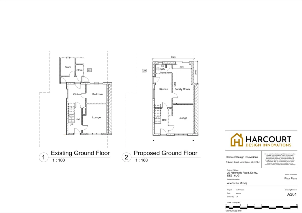 This project involves a single-storey rear extension featuring a lean-to roof with a Velux rooflight. The existing outbuilding will be demolished to accommodate a large family room, a new downstairs WC, and an enlarged kitchen area.